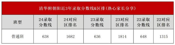 清华附朝阳近年普通班录取分数线及区排名如下(网传版,仅供参考):