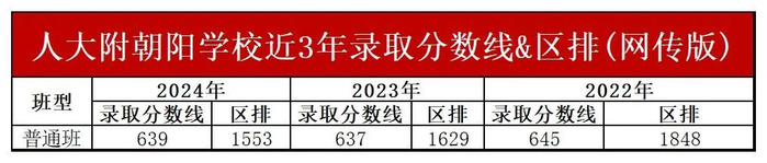 人大附中朝阳学校近年普通班和科创班录取分数线及区排名如下(网传版,仅供参考):