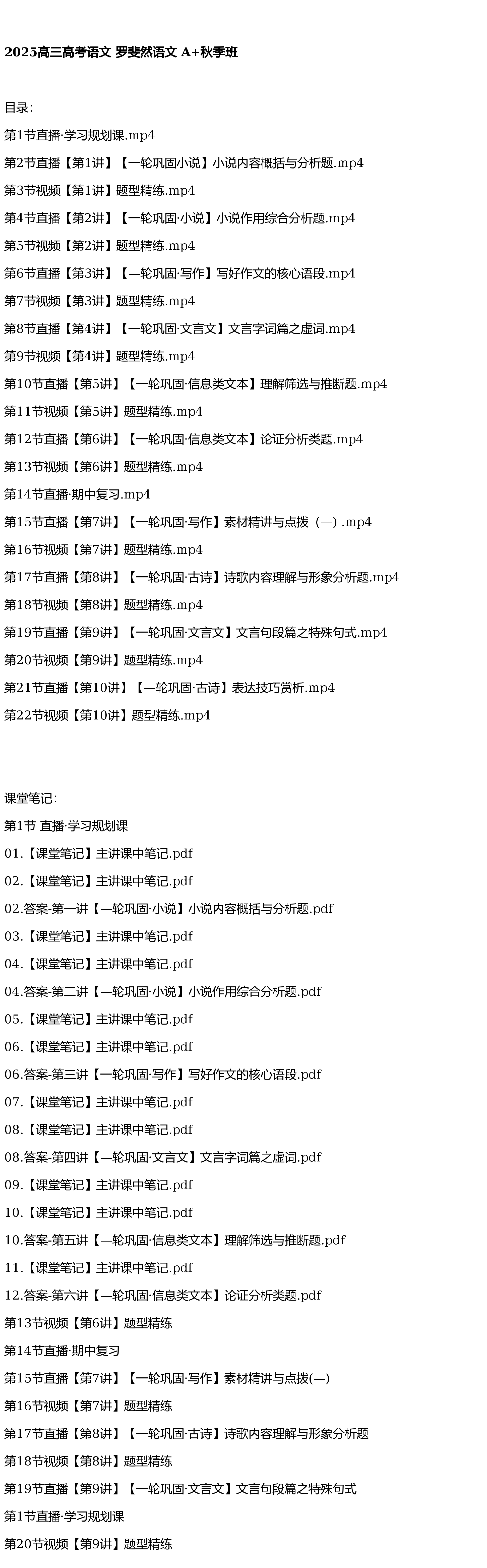 罗斐然老师的2025高三高考语文A+秋季班可能包含以下内容和结构(具体以实际课程安排为准):