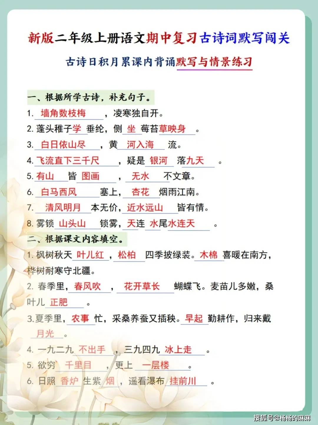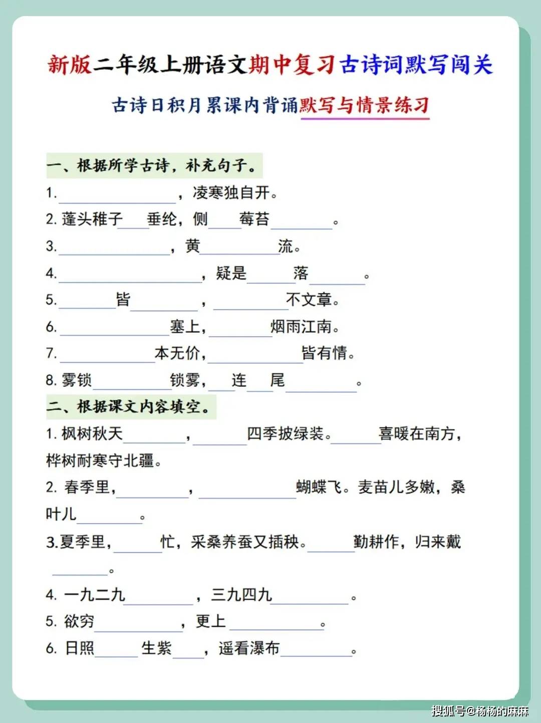 家有二年级娃的家长注意啦!期中复习在即,古诗词记不牢、课文填空总丢分、知识点不会灵活运用?这份二年级语文期中复习古诗词专项资料精准破解痛点,既能帮娃高效冲刺考试,又能培养文学素养,堪称期中复习 神器!