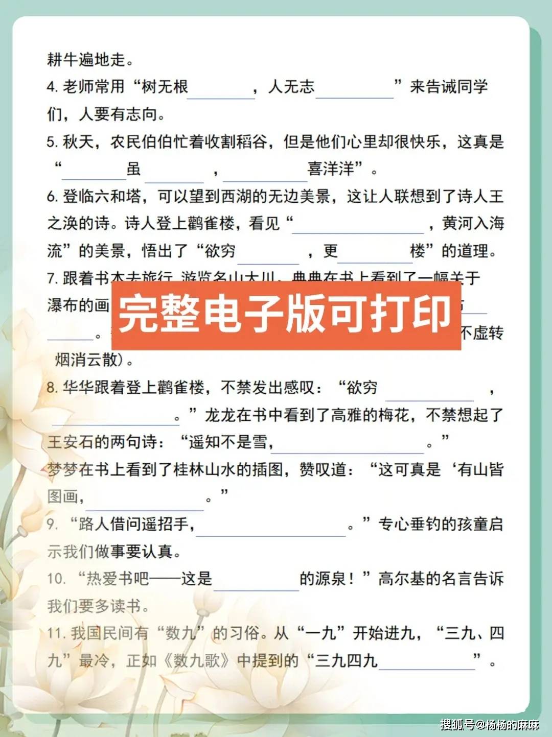 通过这些系统练习,娃不仅能扎实掌握期中考点,高效查漏补缺,还能积累更多经典诗词与优美语句,在反复品读中感受汉语言的韵律美和文化魅力。这些积累的素材,还能为后续语文写作、口语表达添砖加瓦,让娃的表达更有文采。