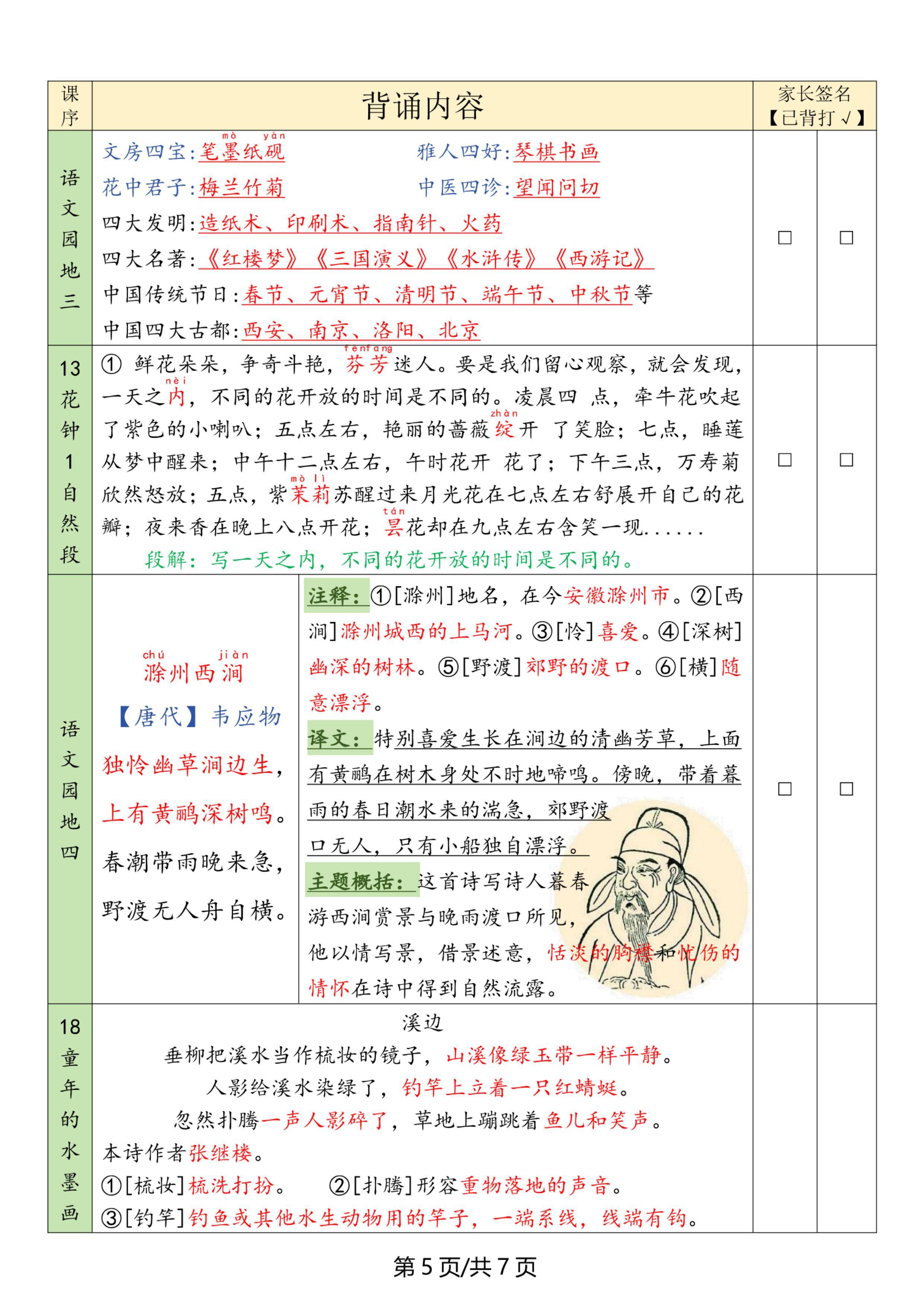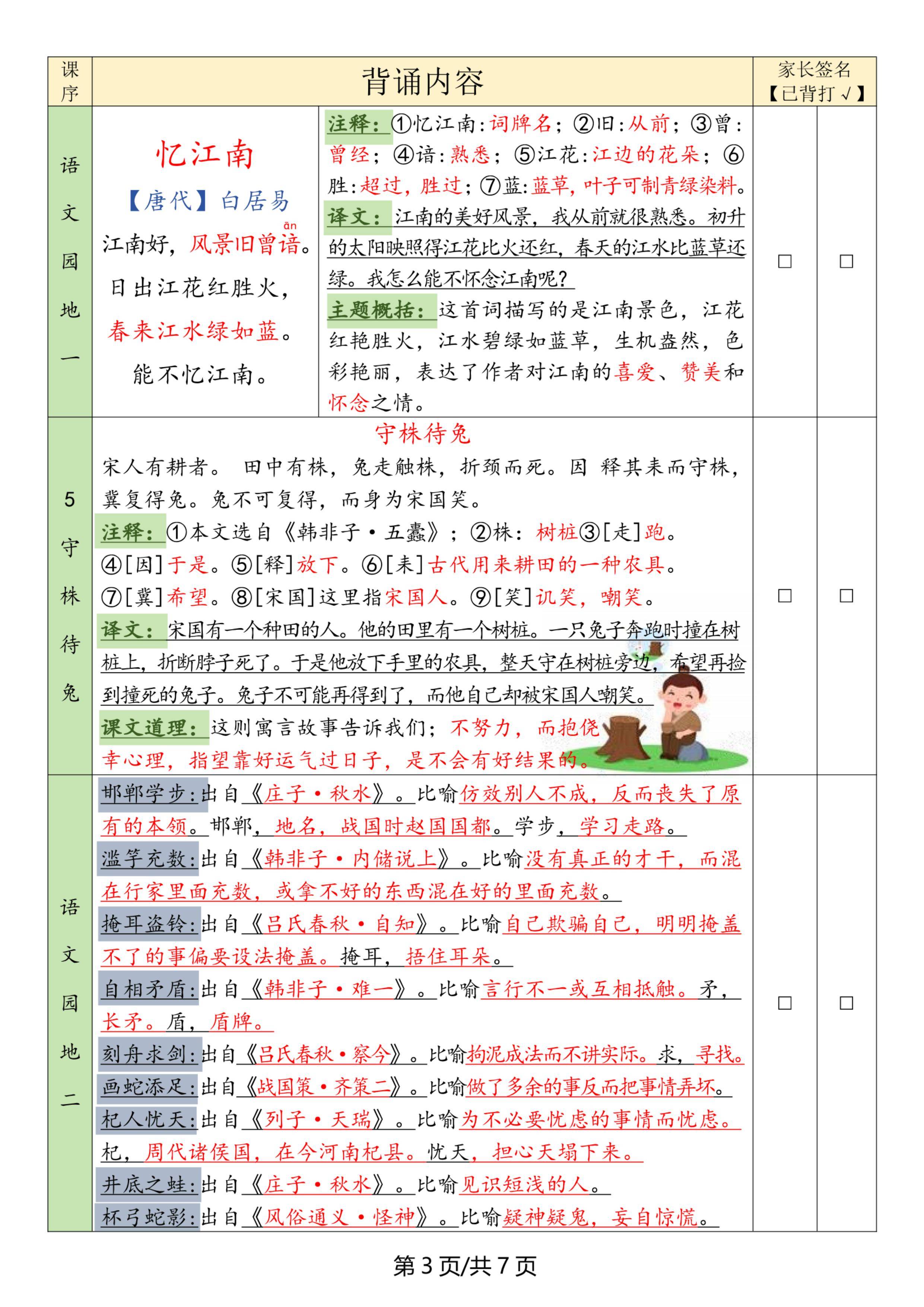在设计上,这份资料采用 背诵 + 默写 + 家长签字 的闭环模式,每天定量完成 1-2 篇内容,既保证积累的持续性,又能通过默写巩固记忆。注释和译文的搭配,让孩子不仅能 背下来,更能 懂其意,避免机械记忆。比如《忆江南》的注释和译文,能让孩子理解 日出江花红胜火 的画面感,体会作者对江南的怀念之情;《守株待兔》的课文道理,则让孩子明白 不努力而抱侥幸心理 的危害,实现语文学习与价值观培养的结合。