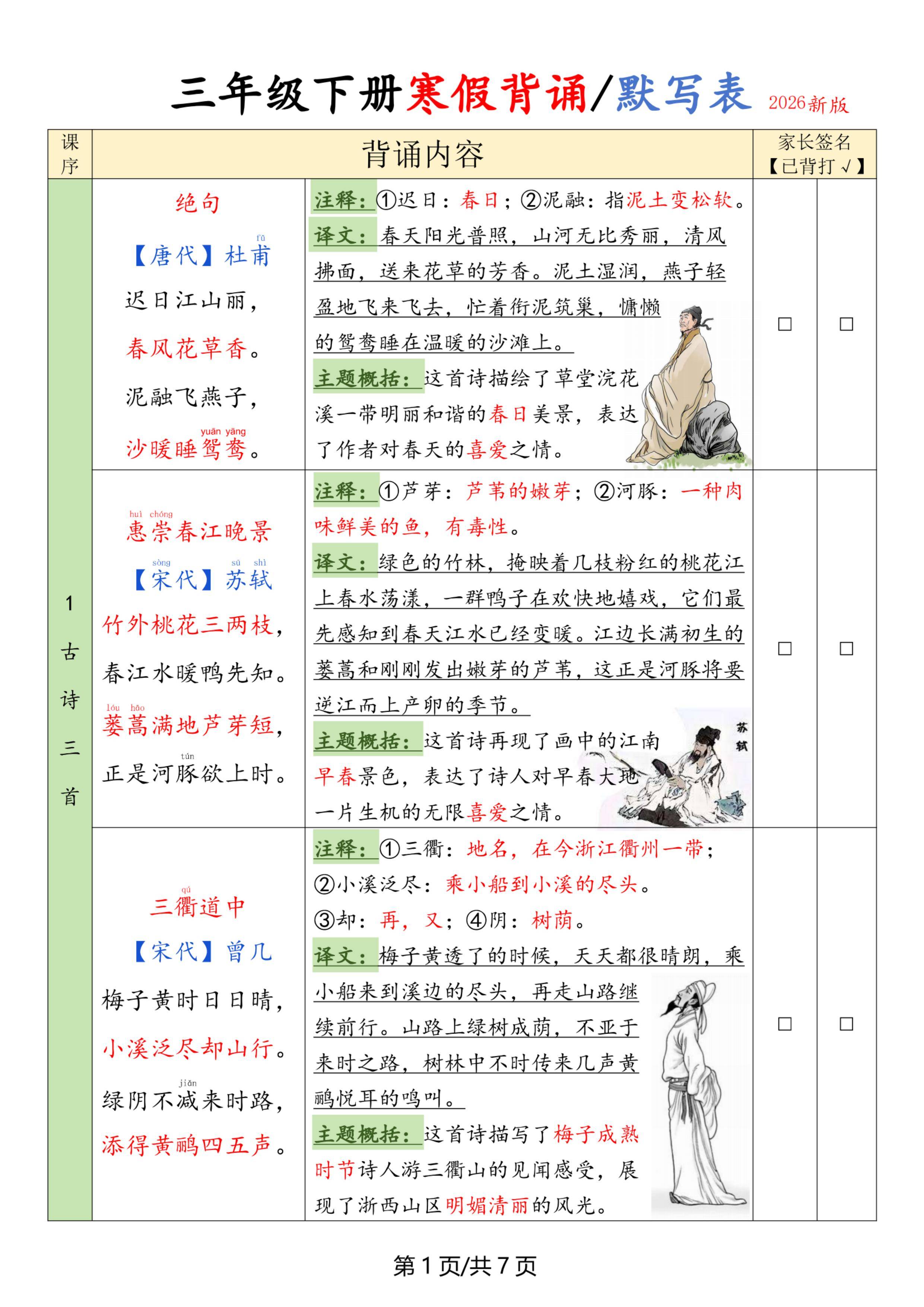 今天为大家分享:0112【26新三下语文寒假背诵默写表(含空表默写)14页。对三年级学生来说,寒假是积累经典、夯实语文基础的黄金期。这套《2026 新版三年级下册寒假背诵 / 默写表》,系统整合了教材核心篇目,是孩子提升语文素养的实用工具。