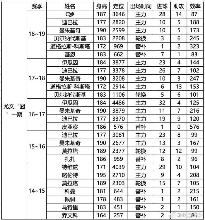 第三则是从整体来看,除了米兰囧一期伊布在的两年,以及尤文囧二期最后一年的弗拉霍维奇,高中锋并不是球队里的主炮,甚至称不上高效,一个赛季各项赛事没办法创造20个进球,(9个赛季里,只有3个赛季有190以上的高中锋进球+助攻超过20个,伊布两次,弗拉霍维奇一次),而更为典型的就是曼朱基奇这种,200分左右造一球的效率。