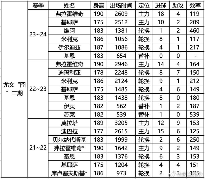这里说明,我通过出场时间大概做了一个划分,一个赛季出场2500分钟以上的算主力,1000分钟以下的算替补,中间的算轮换。巴洛特利和弗拉霍维奇21~22赛季都是冬季加盟,下半季出场时间多,算作主力。另外阿莱格里13~14年只带了半年,球员出场时间不好统计,所以先不列入。