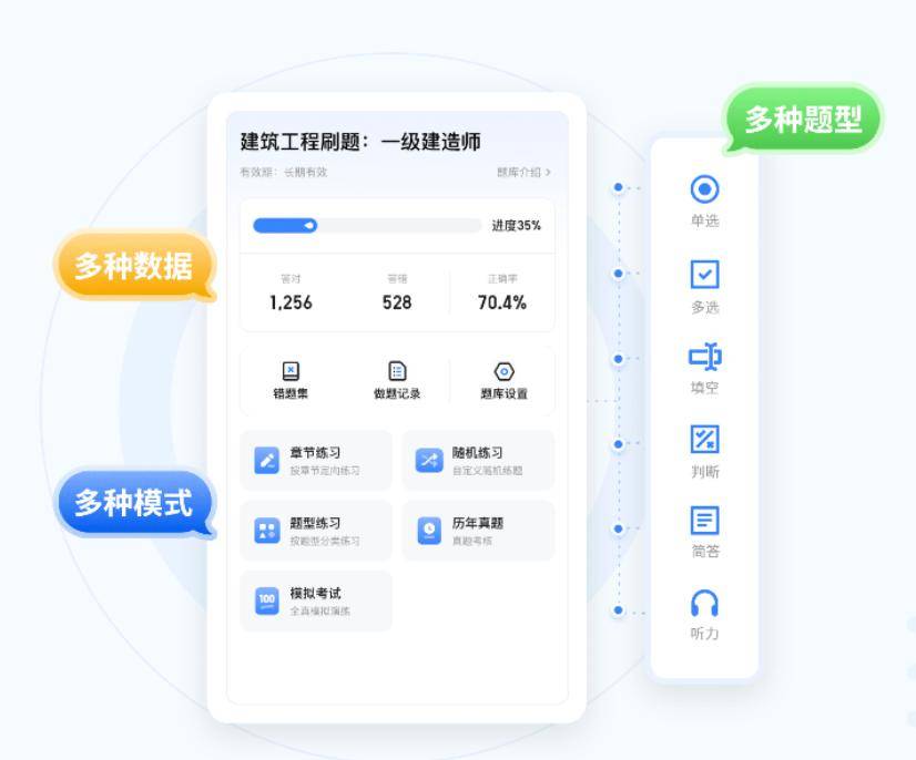 刷题功能全:按章节练、按题型练、模拟考试、刷真题,还有错题集 + 准确率统计