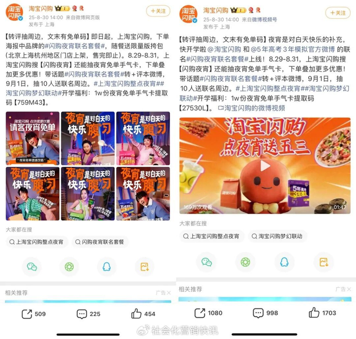 不管学生时代有多么讨厌《五三》,工作以后对《五三》就只剩感慨和怀念了,淘宝闪购在开学季这个节点,联手《五年高考三年模拟》搞事情,推出夜宵复习套餐,打出夜宵是对白天的快乐腹习的神文案。甚至还请来真老师送上祝福:祝你每天五点前下班,三更半夜狂欢!这波操作精准戳中打工人的怀旧神经,让《五三》这个让学生时代又爱又恨的IP,成功变身社会人的情感寄托。
