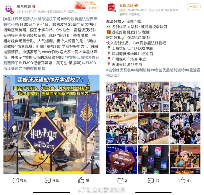 另一边用魔法打败开学现实。今年重返霍格沃茨官方庆典首次来到杭州西湖,邀请中国的魔法师们加入西湖独家返校之旅。名创优品与哈利·波特开启限定联名和快闪,用魔法世界抗衡现实开学焦虑。