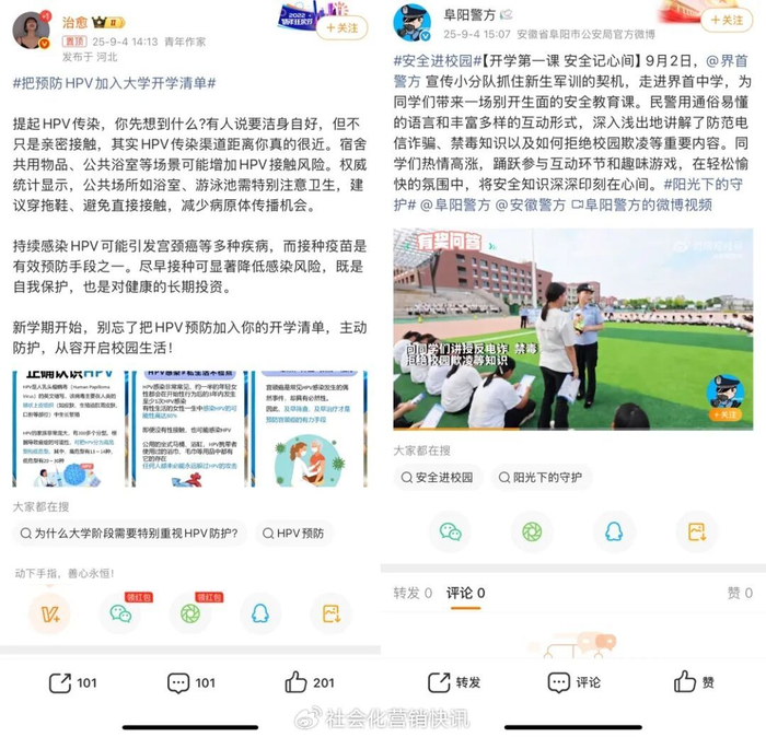 当然,新学期得有新气象,开学遇上九三大阅兵,历史课的热血还未褪去,各校开学第一课就已安排得明明白白:法制安全讲座、心理健康辅导、消防实战,甚至把预防HPV加入大学开学清单的健康科普都来了。这届开学第一课,可谓是一场爱国主义教育、健康科普、法治安全和心理疏导的超级综合课,力求帮助学生们从假期模式无缝切换至上学模式。