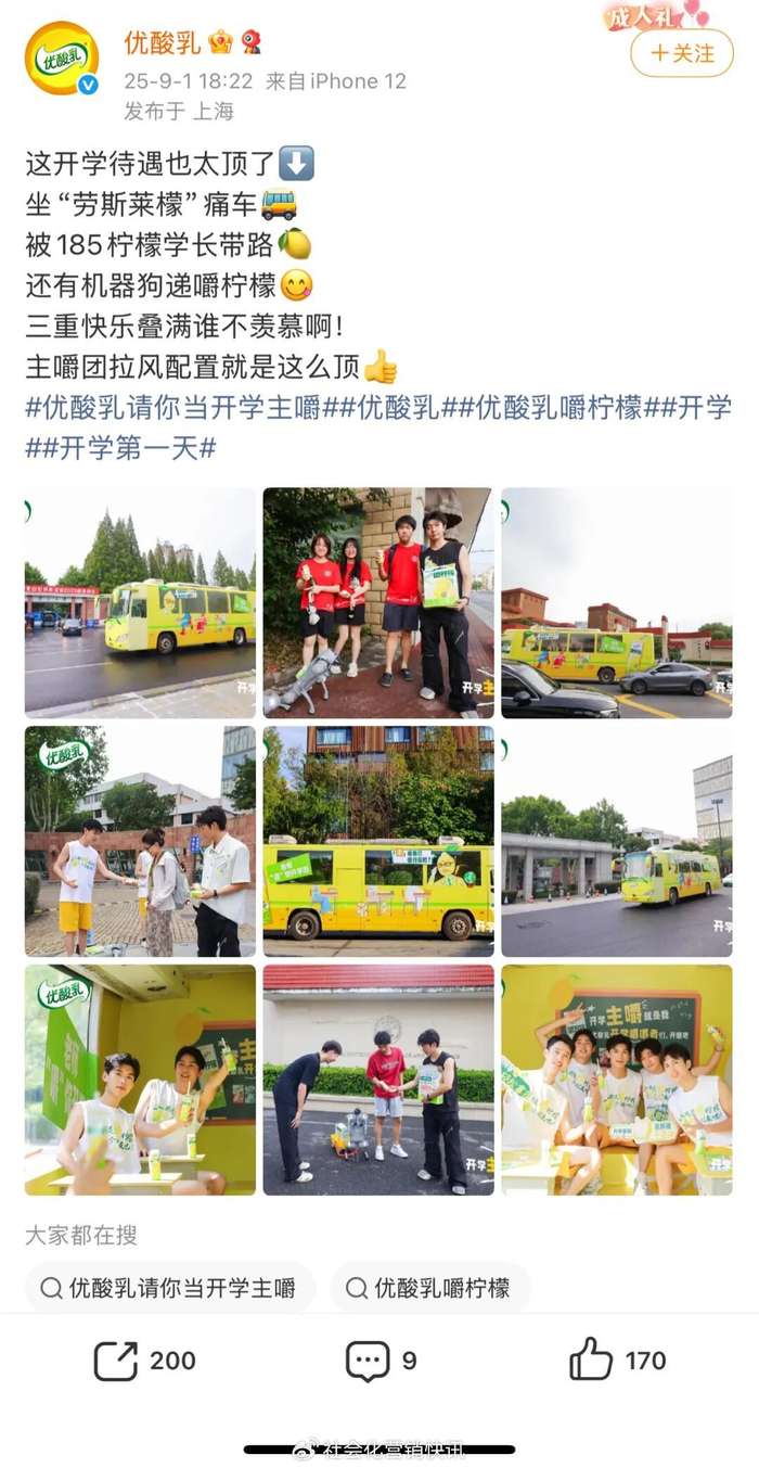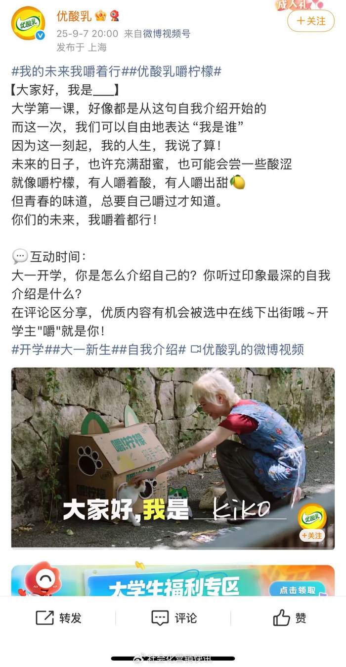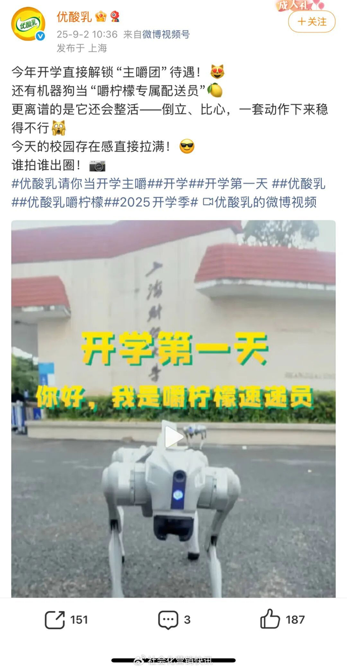 一到开学季,学生党最头疼的莫过于收暑假作业了,品牌都提前备好了开学礼,陆续拿出了自己的暑假作业,一边打造开学专属仪式感,把开学变成嘉年华,比如优酸乳嚼柠檬安排185柠檬学长全程陪报到,柠檬大巴帮运行李,机器狗派送嚼柠檬,自我介绍征集,这波操作让新生体验拉满,学长学姐酸成柠檬。