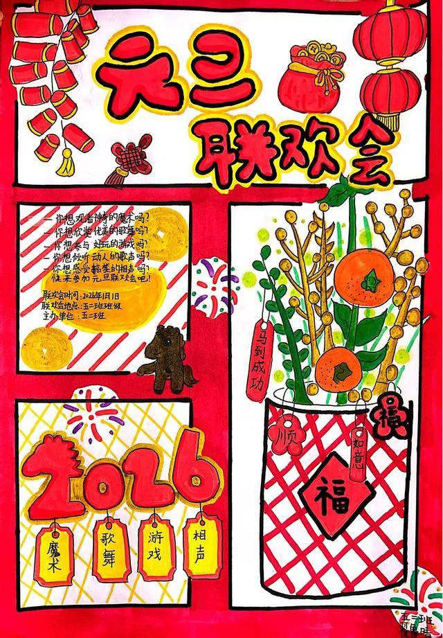 为了培养学生的创意设计与文字表达能力,五年级语文组开展了元旦联欢会海报设计特色作业。教师结合节日主题与语文园地的内容,指导学生完成元旦联欢会海报创作。在这次特色作业中,学生自主构思海报版式、搭配节日色彩,通过撰写宣传语、标注活动信息等方式,将对元旦的期待与创意融入笔尖。此次活动不仅锻炼了学生的审美设计与文字组织能力,更为学生的成长留存了一份鲜活而温暖的节日记忆。