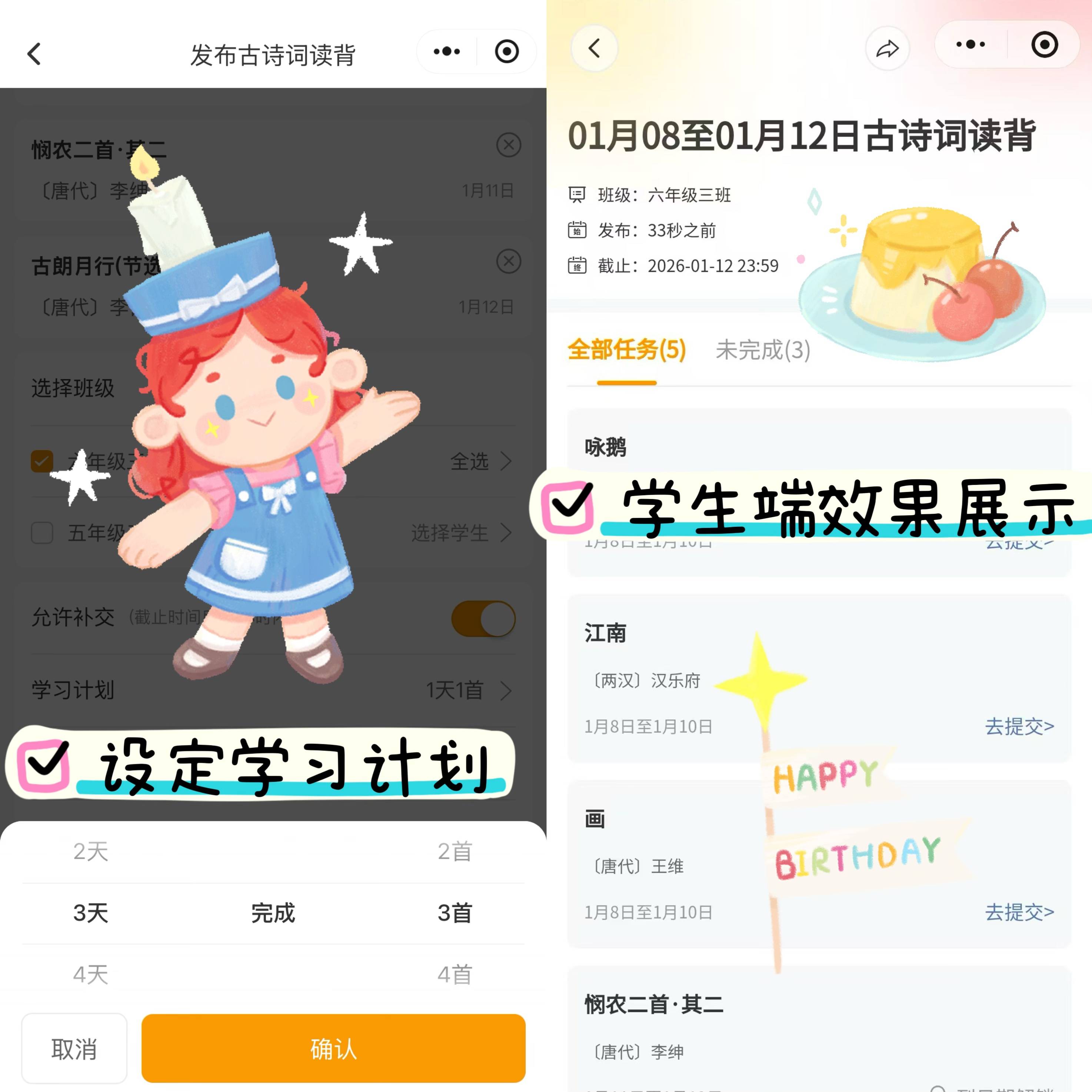 学生读课文、背古诗、听写字词,AI 自动打分检测,不用老师家长挨个检查,彻底解放精力!