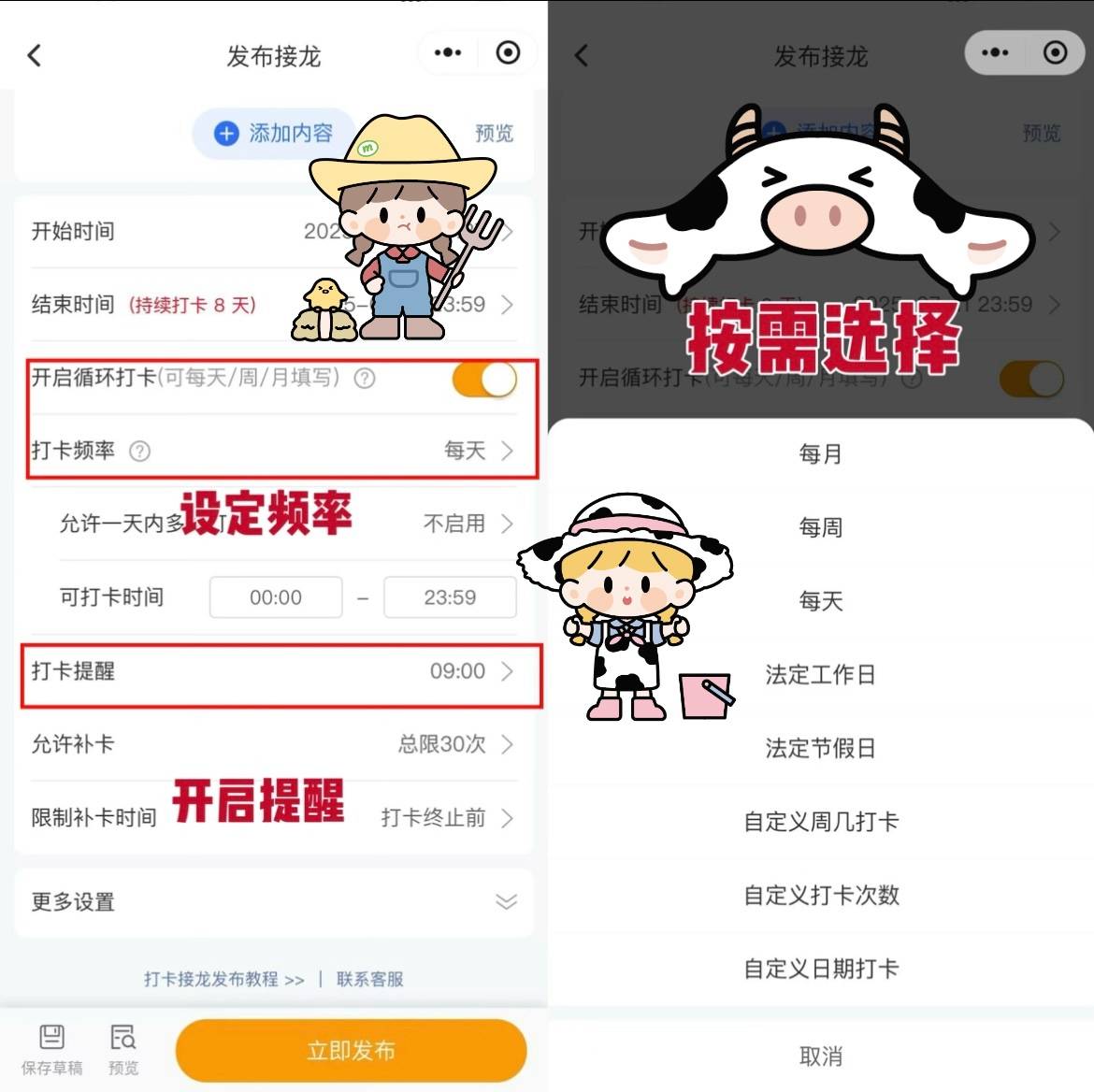 03 循环打卡管整月 打卡习惯自动养成寒假作业要持续一个月?不用重复发布!设置好打卡频率(每天 / 每周 / 自定义时间),就能管整个寒假。