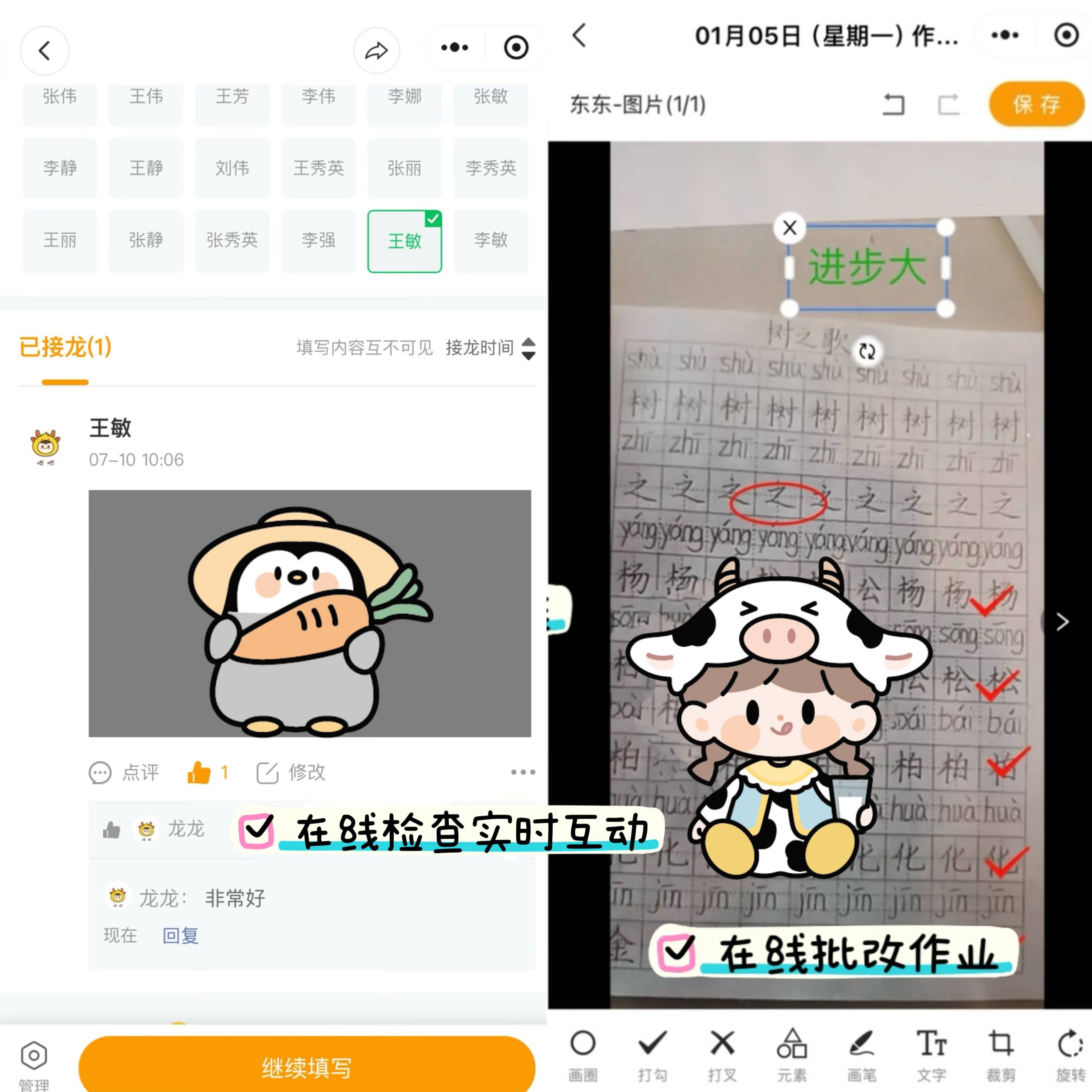 老师在线就能看视频、翻图片,还能直接点评、点赞、批改,和学生互动超及时,反馈效率翻倍~