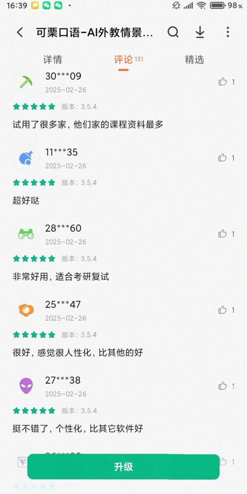 评分:听力资源丰富度:4.2星,学习便捷性:3.8星,口语练习功能:3.0星