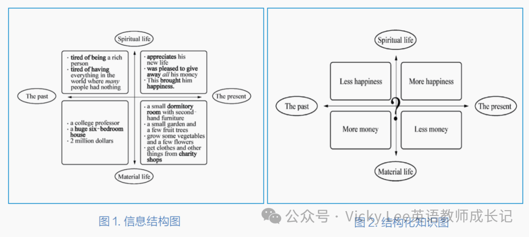 语篇研读:该语篇讲述的是当现实生活中许多人都期盼成为有钱人的时候,一位大学教授查尔斯·格雷(Charles Gray)却将自己的百万家产捐献给了慈善机构,自己过起了简朴的生活。这改变了他原本富有却不快乐的生活,同时使他获得了对生活和金钱的感悟。作者希望通过此文引起人们对金钱与幸福关系的思考:富有并不一定幸福。自给自足之后如何奉献社会,帮助他人,才能够真正带来幸福和快乐。该语篇是一则人物报道,有标题,有导语,有正文,有引语,有立场、观点,具体内容和语言简明准确。主人公的物质生活和精神生活也介绍得很详细,是两条主线。我们的钱跟我们的幸福到底是什么关系?这两者交织在一起,就形成了一张信息结构图,见图 1。