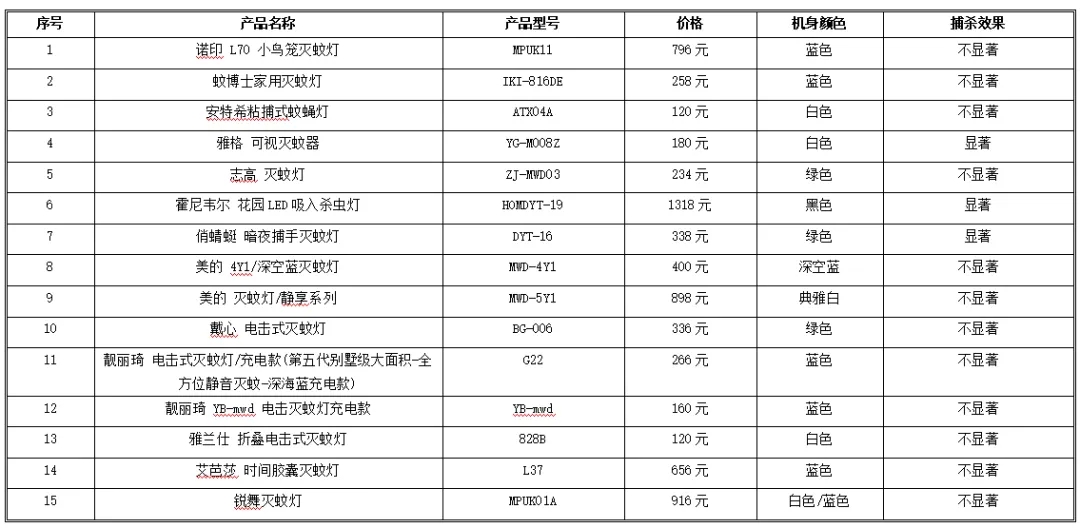 此次比较试验从电商平台随机采购15批次样品,单价覆盖120元至1318元区间。依据GB/T 27785-2011《卫生杀虫器械实验室效果测定及评价 电子灭蚊蝇器》要求开展对比检测,蚊虫捕杀率≥70%评价为效果显著。