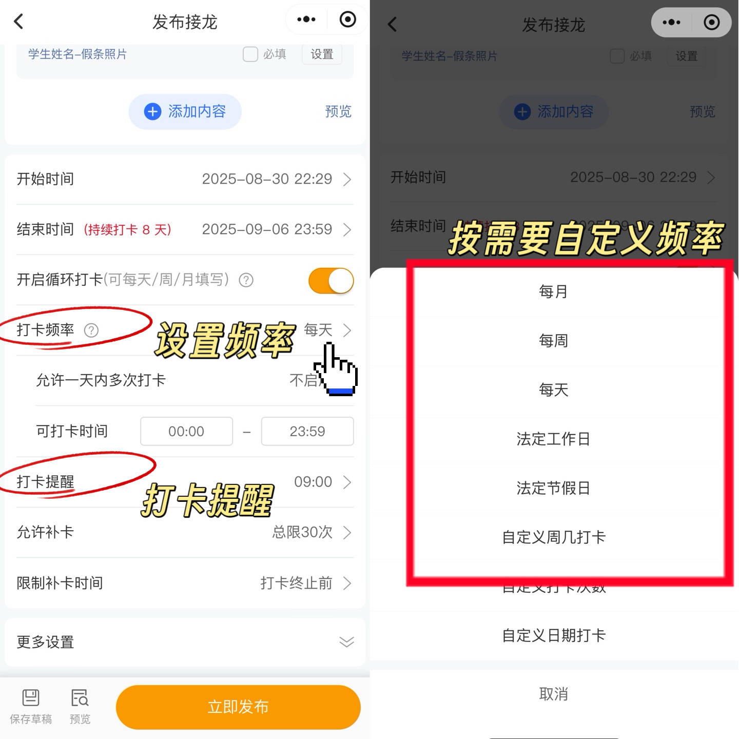 寒假作业要天天 / 周周收?不用重复发接龙!设置好打卡频率(每天 / 每周 / 自定义时间),一条接龙就能管一整个寒假~
