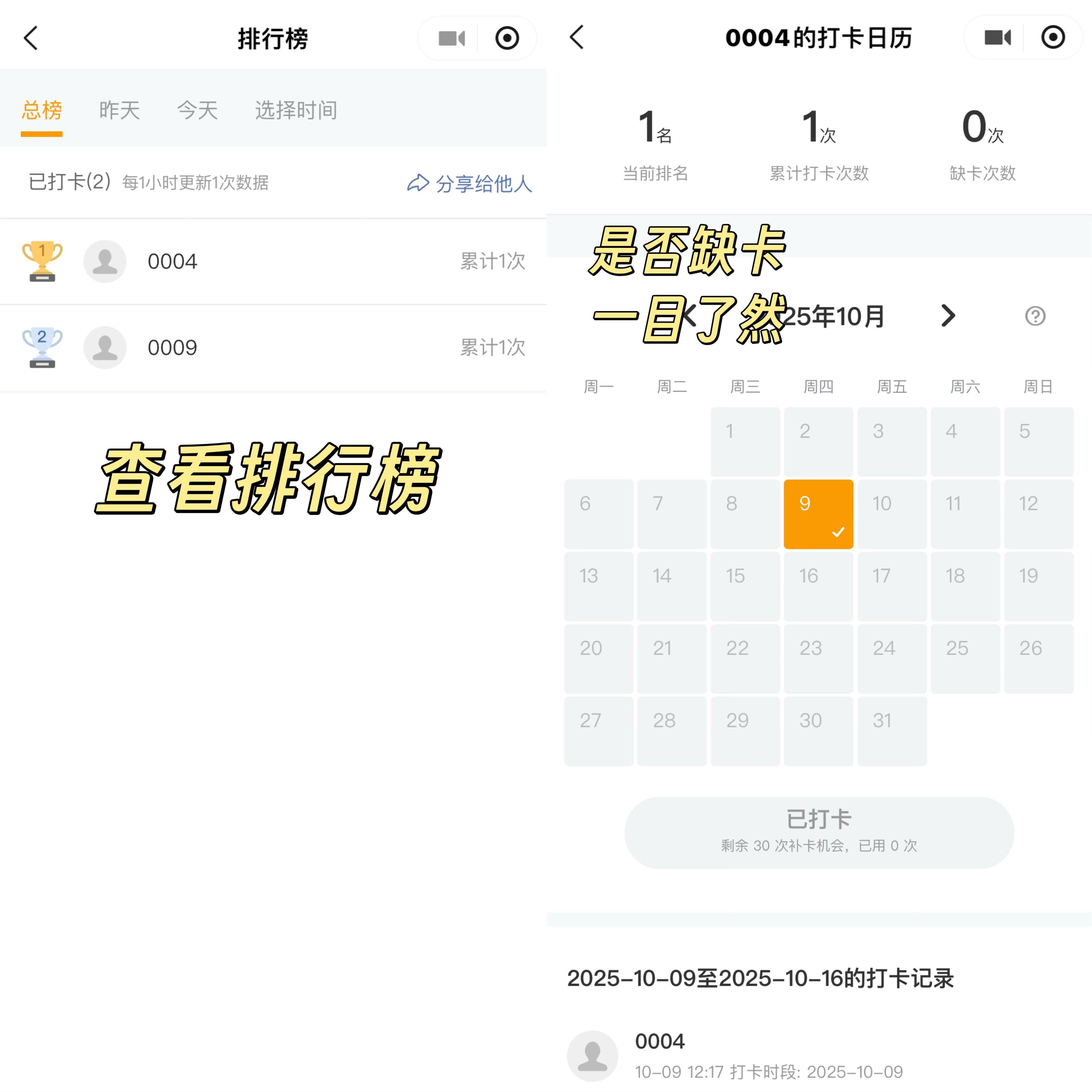 还能定打卡提醒时间,怕学生忘?到点自动提醒!再加上打卡排行榜,谁打卡多谁打卡少一目了然,学生积极性蹭蹭涨~