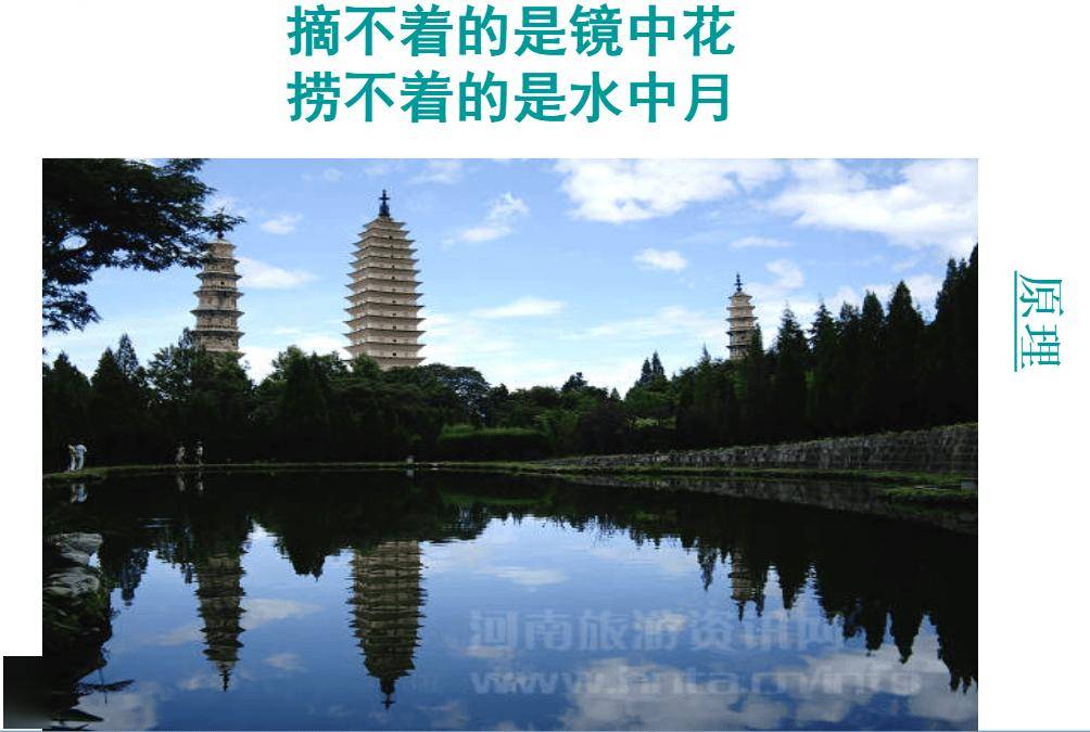 34.一石击破水中天——平静的水面如一块平面镜,可看到天的像,石块投入水中破坏了平静的水面,形成层层水波,水中天的像也就被击破了。