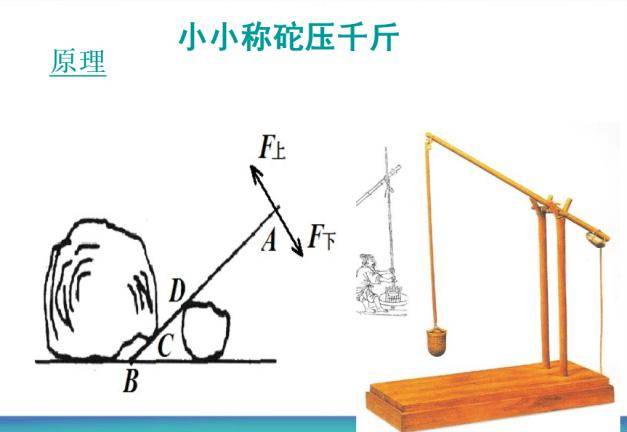 1.小小称砣压千斤——根据杠杆平衡原理,如果动力臂是阻力臂的几分之一,则动力就是阻力的几倍。 如果称砣的力臂很大,那么”一两拨千斤”是完全可能的。