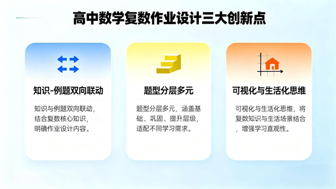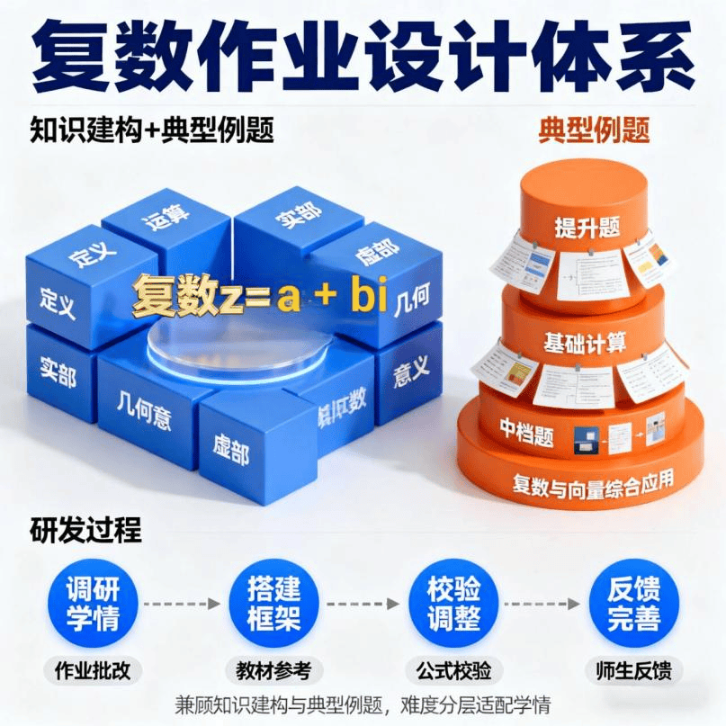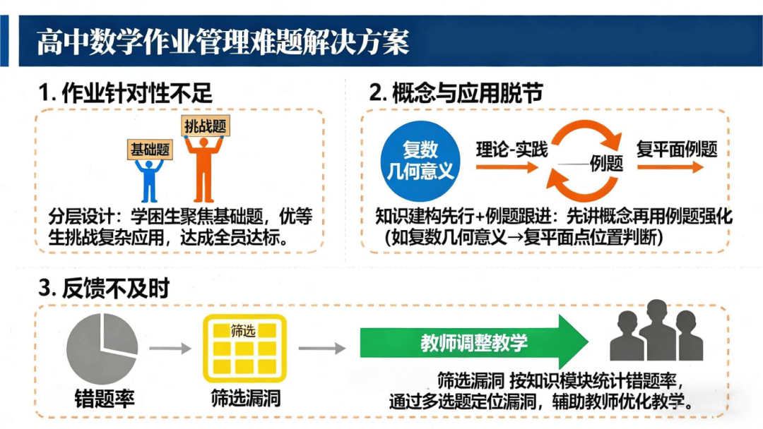 设计针对性破解三类作业管理难题:针对 作业针对性不足,用分层题目让学困生聚焦基础、优等生挑战复杂应用,实现 全员达标;针对 概念与应用脱节,采用知识建构先行 + 例题跟进模式,如先讲复数几何意义,再用 复平面点位置判断 例题强化理解;针对 反馈不及时,按知识模块统计错题率,借多选题精准定位学生知识漏洞,辅助教师调整教学。