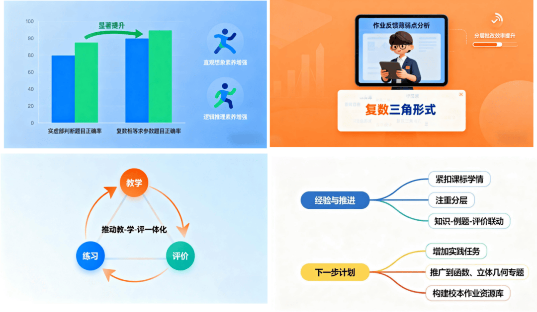 作业实施取得多层面成效:学生层面,实虚部判断复数相等求参数 等题目正确率显著提升,直观想象、逻辑推理素养增强;教师层面,能通过作业反馈定位薄弱点(如复数三角形式),分层批改提升效率;教学层面,形成教学→练习→评价闭环,推动 教 – 学 – 评 一体化。