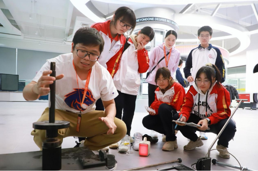 杨伟桢同学一边记录数据,一边和组员讨论:知道了影响滑动摩擦力的因素,就能根据需求调整设计,比如想增强防滑性,就可以选橡胶材质、加深纹路。在他看来,从展厅的原理讲解到实验室的亲手操作,原本抽象的物理知识变得鲜活可感,真正做到了学以致用。