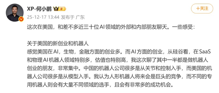 不久前,小鹏汽车的创始人何小鹏开启了一场美国之旅,他在微博中,也重点提到了对物理AI的看法。